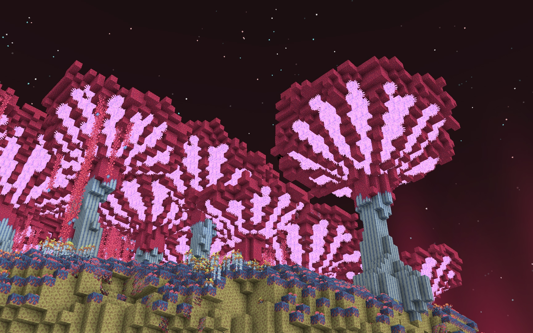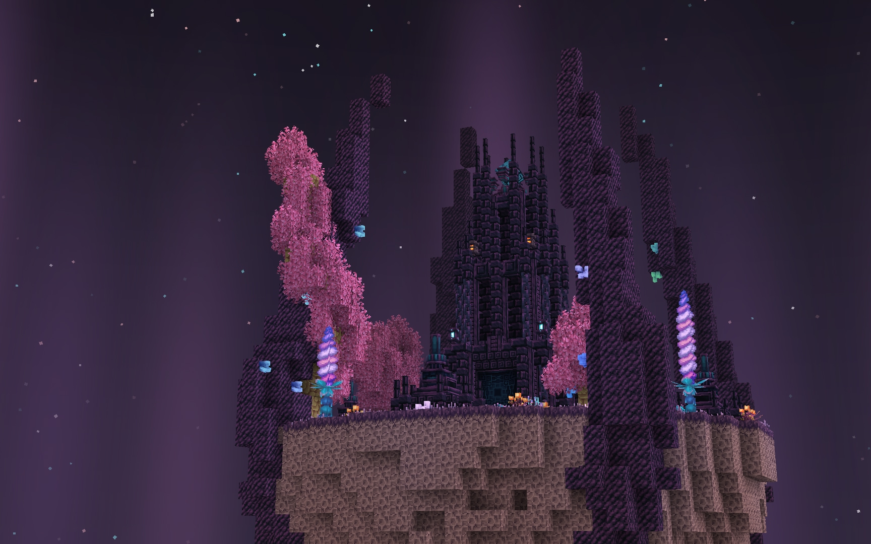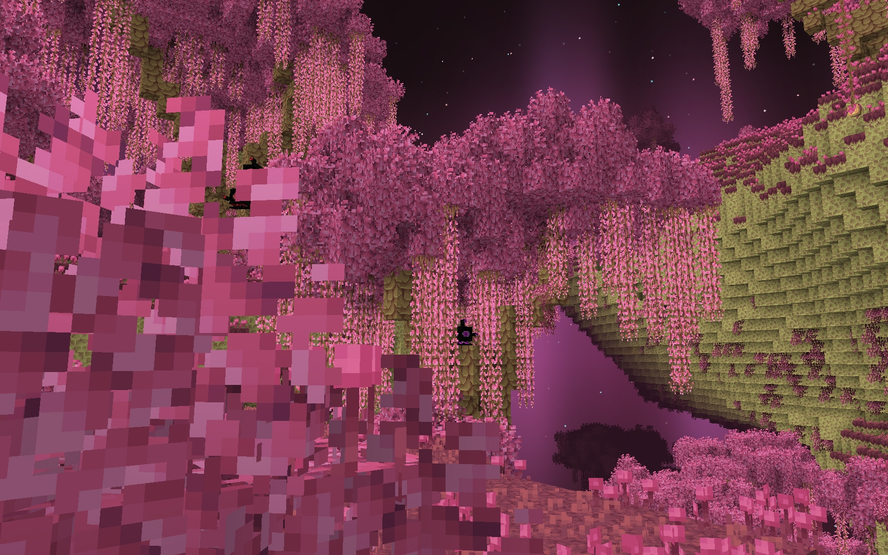 Welcome to the first biome of the updated dimension — Blooming Peaks! These are split flying islands overgrown with pink trees and vines.