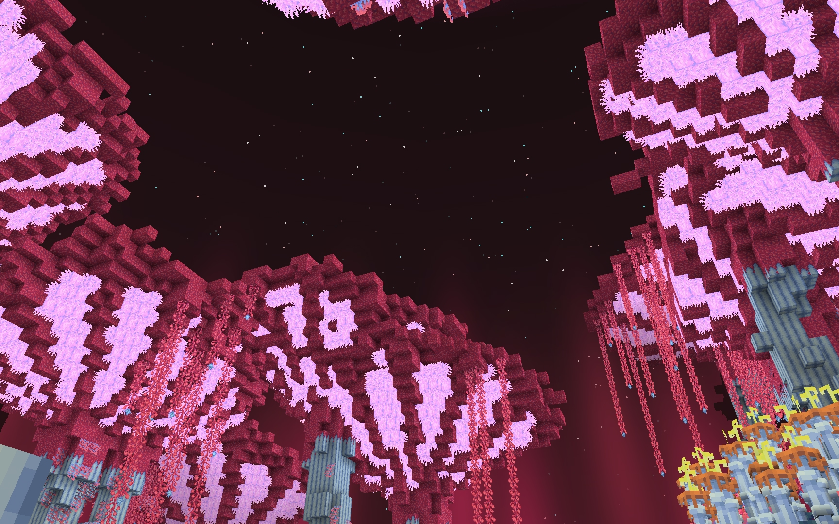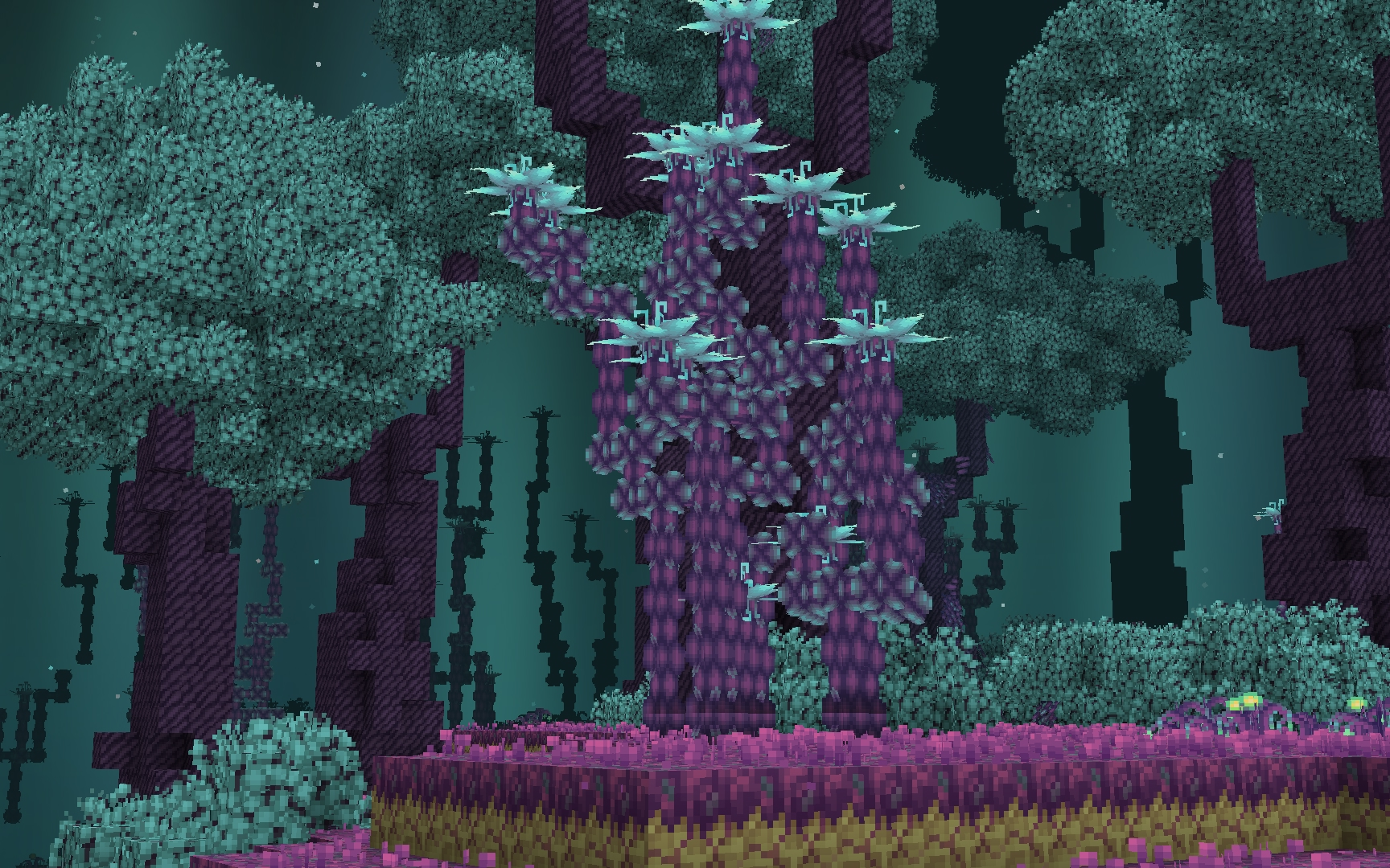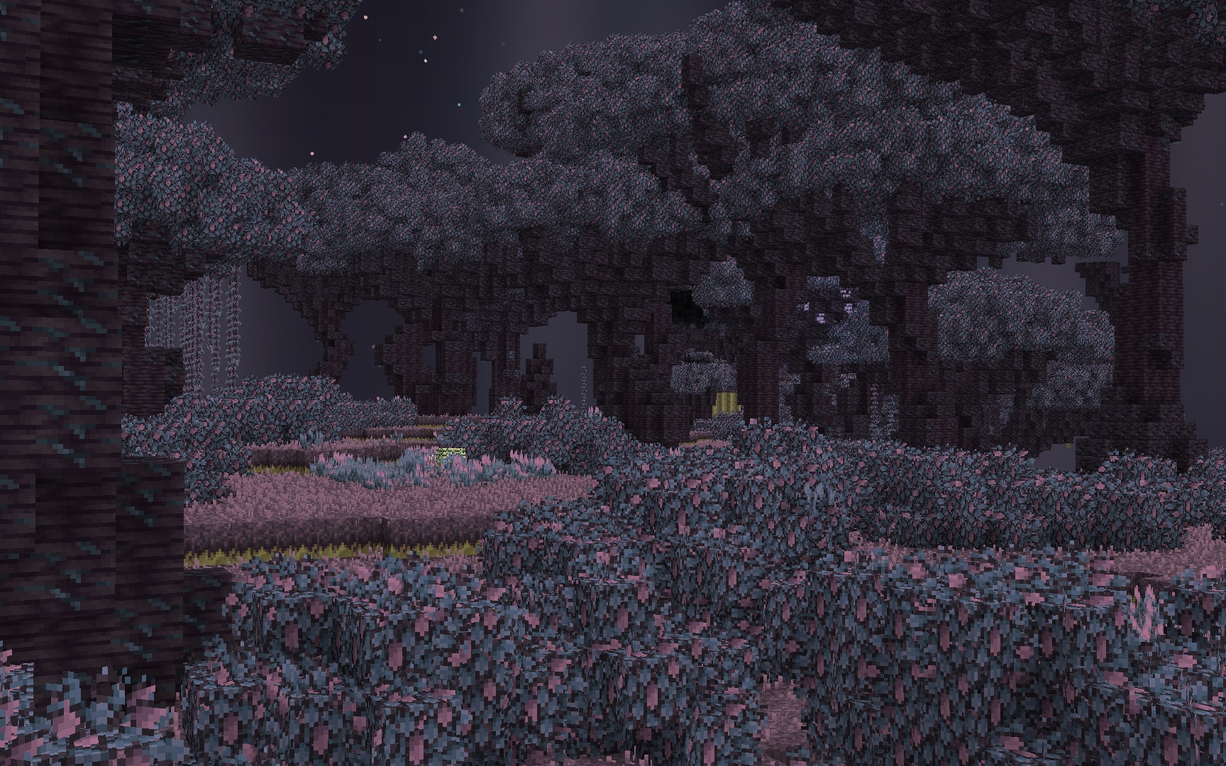 Welcome to the first biome of the updated dimension — Blooming Peaks! These are split flying islands overgrown with pink trees and vines.