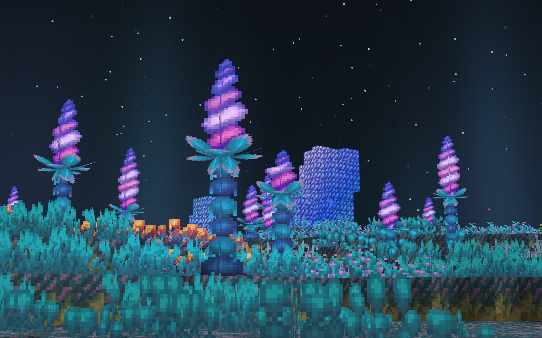 A flat biome extending into the distance, filled with the radiance of crystals and unusual plants.