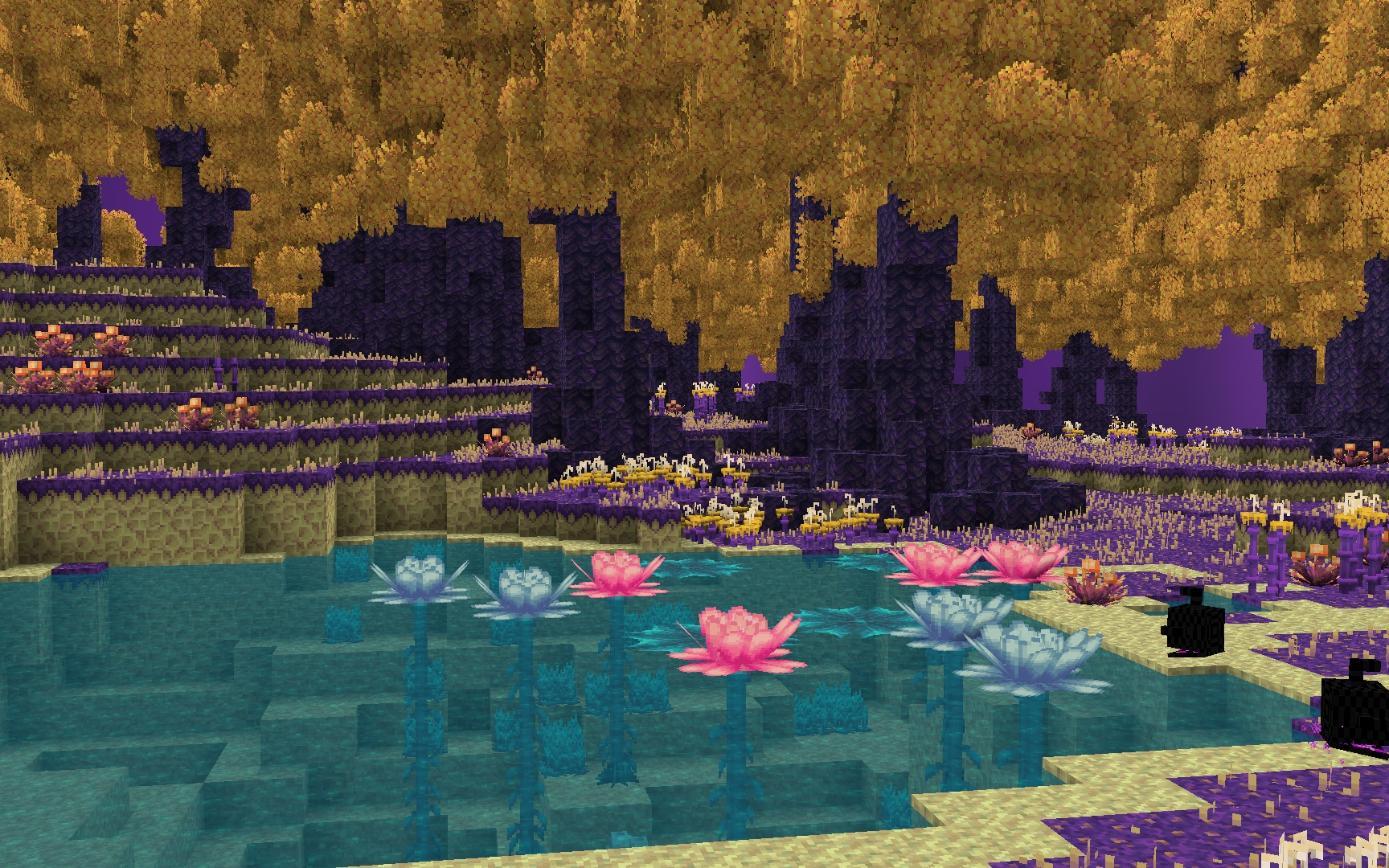 A purple grass biome overgrown with tall trees with golden crowns. Sometimes there are small picturesque lakes with flowers.