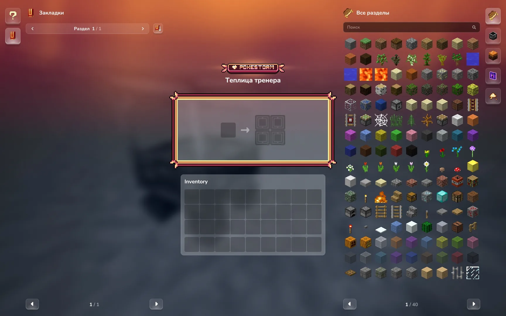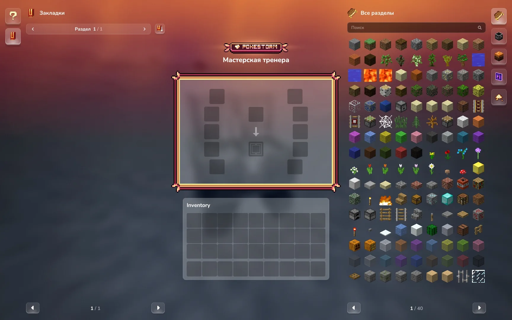 С самого начала вы окажетесь в мире, где покемоны свободно бродят по биомам, а их поведение и появление зависят от времени суток, погоды и локации. Ваша первая задача — найти и поймать своего первого покемона. Для этого вам понадобится Покебол, который можно создать из материалов, добытых в мире. Исследуйте окрестности, собирайте ресурсы, чтобы начать крафтить необходимые предметы.
